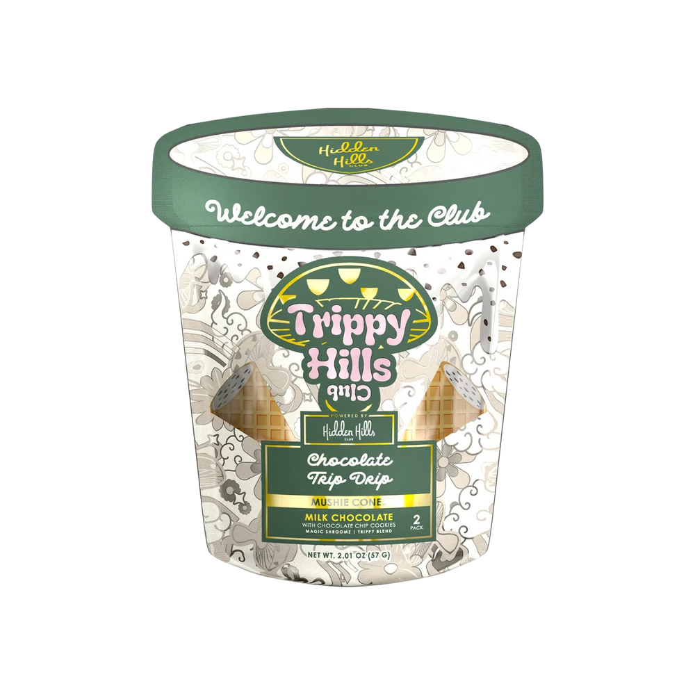Hidden Hills Trippy Mushie Conez – Chocolate Chip Cookies oferece uma experiência com cogumelos Amanita sem psilocibina, combinando sabor suave de chocolate ao leite e cookies para uma jornada deliciosa e elevadora de humor.