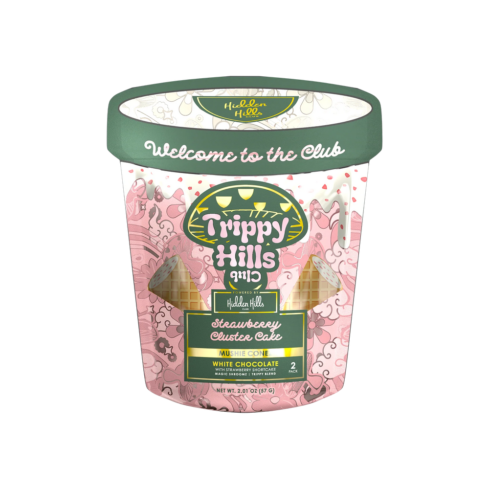 Hidden Hills Trippy Mushie Conez – Strawberry Cluster Cake proporciona uma experiência com cogumelos Amanita sem psilocibina, combinando chocolate branco intenso e sabor de bolo de morango para uma jornada suave que eleva o humor.